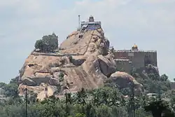 The Rockfort is a fortress which stands atop a 273-foot-high rock.[10] It consists of a set of monolithic rocks accommodating many rock-cut cave temples. Originally built by the Pallavas, it was later reconstructed by the Madurai Nayaks and Vijayanagara rulers.[11] The major complex in the temple are believed to be built during the 8th century by the Pandyan Empire.[12] The temple is maintained and administered by the Hindu Religious and Charitable Endowments Department of the Government of Tamil Nadu.[13]