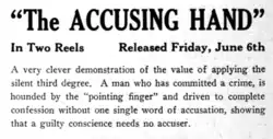 The Accusing Hand is a 1913 American short silent Western film directed by Romaine Fielding. It stars Fielding himself with Mary Ryan and Robyn Adair. The film was produced by and distributed by Lubin Manufacturing Company. The Accusing Hand was shot in and around Tucson, Arizona.[1]