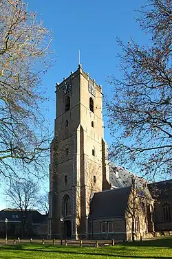 The village is seen from the south-east. The road was called the Boomgaardweg, but is now the Steene Weg,[13] or Steneweg. The top of the church tower has been rebuilt, and the spire was removed by the French in 1811 to make a semaphore station, connecting The Hague with Paris. The smaller tower to the right of the church, seen between the trees, is the town hall, built in 1639, and the barn to the right survived until the 1870s.[14]