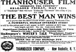 The single reel drama, 957 feet (0.29 km) long, was released on May 13, 1910.[1] Whether the film is 957 feet (0.29 km) or 950 feet (0.29 km) long is subject to debate. Bowers notes that some sources state the film is 950 feet (0.29 km) long, one such example is the advertising for the film which lists it as being approximately this length.[1][11] Advertising for the film recognized the negativity of Friday the 13th and used it to promote the film to redefine the date to instead bring joy.[11] The film was shown across the United States, advertisements for the showing included theaters in Kansas,[12] Texas,[13] and Pennsylvania.[14] Identifying the theaters showing this work is complicated by the identically named The Best Man Wins by Vitagraph. The silent western produced in 1909 was still being shown and advertised in theaters at the time of the release of Thanhouser's film. An ambiguous advertisement, but most likely a Vitagraph reference, is seen in The Hawaiian Star of Hawaii was published on the same day of the Thanhouser release.[15]