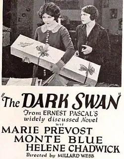 The Dark Swan is a 1924 American drama film directed by Millard Webb and written by Frederick J. Jackson. It is based on the 1924 novel The Dark Swan by Ernest Pascal. The film stars Marie Prevost, Monte Blue, Helene Chadwick, John Patrick, Lilyan Tashman, and Vera Lewis. The film was released by Warner Bros. on November 26, 1924.[2][3][4][5]