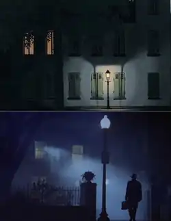 Father Merrin's arrival scene was filmed on Max von Sydow's first day on set. The scene where he steps out of a cab and stands in front of the MacNeil residence, silhouetted in a misty streetlamp's glow and staring up at a beam of light from a bedroom window, is one of the most famous scenes in the movie, used for film posters and home media release covers. It was inspired by René Magritte's 1954 painting Empire of Light.[71] Friedkin wanted to evoke visually the language Blatty used in the novel for this scene, likening Merrin to "a melancholy traveler frozen in time", standing next to a streetlight in the fog when he gets out of the cab.[70]
