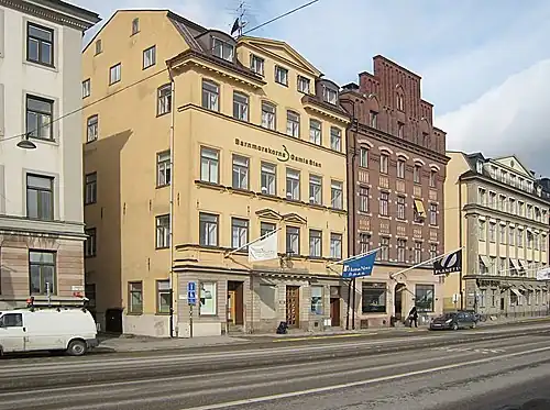 In the corner towards Pelikansgränd (marked as I on the map) lies an older plastered house with a painted socle. The current old-fashioned facade is primarily a work from 1967 when the house was under renovation, even though the portal is older. The building had a rusticated facade in the beginning of the 20th century.