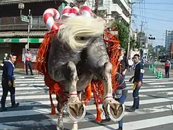 The decorated horses were originally those for Shinto priests (kannushi), twelve in number, and in the Hosokawa clan period, only upper-class samurai families presented horses. The distance from the shrine to the otabisho (destination of the parade) was short, and kannushi did not ride on the horses. Therefore, the decorations on the horses became gradually gala and greater. The decorations on the horses were originally from the symbols of sexual organs. There had been two schools, but only Ando school has been observed. After the Meiji Restoration, decorated horses were prepared by town people, and recently the decorated horses number about 60. In 2007, the horses numbered 67, and following people (seko) numbered 17,000, indicating that this is the biggest festival of Kumamoto city.