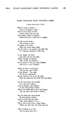 "Plain Language from Truthful James" (or "The Heathen Chinee") was very popular among general readers. One New York newspaper reported on the frenzy over the poem: "Strolling down Broadway... we saw a crowd of men and boys, of high and low degree, swarming about a shop-window, pushing, laughing, and struggling... Elbowing our way through the crowd, we discovered an illustrated copy of Bret Harte's poem 'The Heathen Chinee.'"[13]
