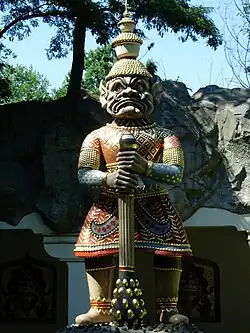 The show is built on Indian Temple Square with a large fountain, Indian decorations and 2 Yaksha giants. This mixture of Indian and Thai elements could be a reference to Wat Phra Kaew. A large door behind the fountain gives access to a dark cavern where a large corridor leads to the scene of the jungle lake, enclosed by tropical plants, a creek and a waterfall. The singing of the witch begins the show; she summons the fairies to dance on the water-lilies of the lake, guided by the music of an orchestra of frogs and the song of geese. The frogs are the only part where the technology was bought; the rest of the ride was developed in-house.
