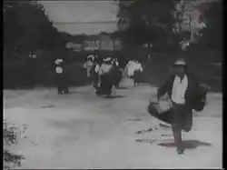 The Lost Child has been singled out by several commentators as one of the most interesting early American chase films, possibly inspired by earlier British film such as Desperate Poaching Affray. Joyce E. Jesionowski mentions it as one of the best chase films made by the Biograph Company before the arrival of D.W. Griffith, showing "a firm grasp of continuity cutting" and where "the chase is not a device that hypes the joke, it is the vehicle of the joke."[5] She furthers refers to the film as a "good example of pre-Griffith accumulation chase" where the distraught mother is joined by a line of heteroclit pursuers and where "activity is extended from background to foreground to exploit the spatial extent of the frame."[6] Finally she stresses the contribution of cinematographer Billy Bitzer in producing a "smooth passage of action from shot to shot."[7]