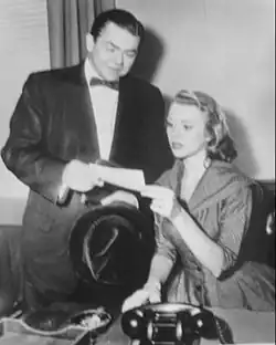 Michael Anthony (Marvin Miller) hands check to Betty Perkins (Inger Stevens) in a 1956 episode