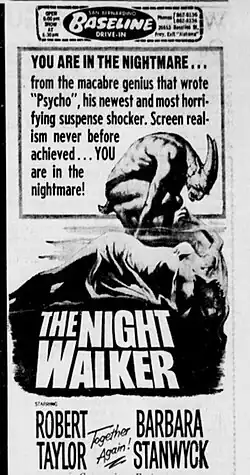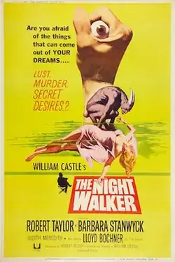 The Night Walker is a 1964 American psychological horror film[1][2] directed and produced by William Castle, written by Robert Bloch, and starring Robert Taylor, Judith Meredith, Lloyd Bochner and Barbara Stanwyck in her final theatrical film role. It follows the wife of a wealthy inventor who is plagued by increasingly disturbing nightmares, which escalate after her husband's death. It was the final black and white film made by Universal Pictures.[3]