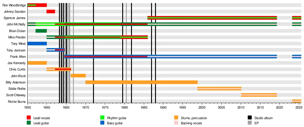 - Mike Pender – lead and backing vocals, lead and rhythm guitar (1960–1985)
