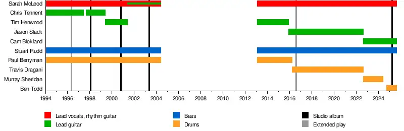 - Sarah McLeod – lead vocals, rhythm guitar (1994–2004, 2013–present), lead guitar (2001–2004)