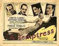 The Temptress is a 1926 American silent romantic drama film directed by Fred Niblo and starring Greta Garbo, Antonio Moreno, Lionel Barrymore, and Roy D'Arcy. It premiered on October 10, 1926. The film melodrama was based on a novel by Vicente Blasco Ibáñez adapted for the screen by Dorothy Farnum.[1]