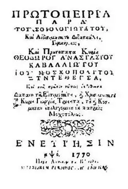 In 1770, he published in Venice, at Antonio Bortoli's printing press, a school textbook, called Protopeiria.[12] Protopeiria is a 104 pages textbook, which in pages 15–59 included a trilingual lexicon of 1,170 Greek, Aromanian and Albanian words.[13] This work aimed at the Hellenization of the non-Greek-speaking Christian communities in the Balkans.[14][15] The lexicon was re-published in 1774 by the Swedish[16] professor Johann Thunmann, who taught at the University of Halle-Wittenberg. Thunmann added a Latin translation to the words in Greek, Aromanian and Albanian.[17]
