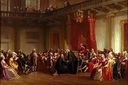 In 1742, Hutchinson was again elected to the General Court, where he served until 1749, being the body's speaker from 1746 to 1749.[16] His continued advocacy of currency reforms so annoyed the populist faction that the need to guard his properties in Boston and Milton from possible mob action was discussed.[17] When the British government was convinced to refund the province's expense for mounting the 1745 Louisbourg expedition, Hutchinson seized upon the idea of using the massive payment (about £180,000 in gold and silver) to retire the province's paper currency. Despite significant opposition, Hutchinson successfully navigated a bill implementing the idea through the assembly's general court in 1749; it received the agreement of the Governor's Council, and also the signature of Governor William Shirley. Many of the bill's opponents were pleasantly surprised when the exchange of paper for specie did not cause any financial shocks, and Hutchinson's popularity soared.[18]