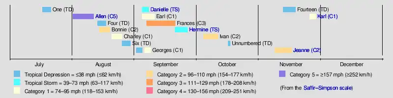 The season produced fourteen tropical depressions, of which 12 intensified into tropical storms, four became hurricanes and two became major hurricanes.[nb 2] The only significant storm during the season was Hurricane Allen, a long-lived Cape Verde-type hurricane that became one of the strongest hurricanes recorded in the Atlantic Ocean, as well as the earliest Category 5 hurricane on the Saffir–Simpson scale ever recorded, a record that stood until Hurricane Emily during the 2005 season. Allen reached its peak intensity with maximum sustained winds of 190 mph (305 km/h) with a minimum barometric pressure of 899 mbar (hPa; 26.55 inHg).