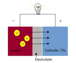 A battery is shown using titanium disulfide as a cathode. Lithium ions intercalate and deintercalate the layered titanium disulfide cathode as the battery is charged and discharged.