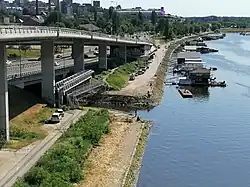 Due to the road, bridge and interchange construction, the section of the river was moved 20 m (66 ft) to the east. As this is the location where the stream of Kaljavi Potok flows into the Topčiderka, its mouth was also moved while the final 100 m (330 ft) of its flow were conducted underground, through the pipes. The new bridge is 19 m (62 ft) long and 26 m (85 ft) wide, with three lanes in each direction.[14] The works on the relocation of the river began on 1 March 2018,[15] and were finished by August 2019.[16] The bridge became operational on 22 March 2019.[17] Further widening of the boulevard along the river began in the late summer of 2019, and was set to finish in the spring of 2021, but the deadline was moved to September 2021, then to May 2022,[18] and to October 2022,[19] before the deadline was moved for the summer of 2024.[20] In October 2023 mayor Aleksandar Šapić blamed the Russian invasion of Ukraine for further delays.[21]