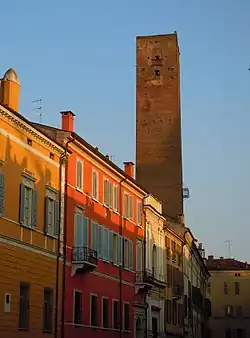 The tower was built in 1281 by the Acerbi family, however, the tower takes its present name from a rectangular metal cage, erected in 1576 under Duke Guglielmo Gonzaga. The cage measured two meters long, one meter deep and high, perched about a third of the height. The cage was used to publicly expose criminals. Some documents indicate it was used to execute some prisoners, including in 1500, a Dominican friar arrested in a house of ill-repute, after giving mass despite being illiterate, as well as other crimes including murder. In 1798, the owner was instructed to destroy the cage as a symbol of tyranny, but it was retained, apparently as a curiosity.[1][2] Some sources say the tower, was built in 1302 by architect Botticella Bonacolsi.[3]