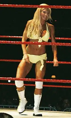 Wilson's start in wrestling came when she attended a World Championship Wrestling (WCW) show with her boyfriend in 1999.[7][8][9] After going backstage, she was asked to walk out to the ring with Scott Steiner.[7] Later, Kevin Nash expressed an interest in doing a storyline with her.[5][7][9] She first appeared on the February 8, 1999, episode of Nitro (later named "Samantha"). It was revealed, in the storyline, that Wilson was brought in by the New World Order (nWo) to seduce David Flair into turning against his father, Ric Flair.[5][15] They appeared together on February 21 at SuperBrawl IX when Wilson slapped Ric, and David zapped him with a taser.[16] After Ric won the WCW World Heavyweight Championship from Hollywood Hogan at Uncensored inside a Barbed Wire Steel Cage match, David and Wilson took some time off from WCW television in April before returning in May, when Wilson would accompany David to the ring for matches. At the 1999 Bash at the Beach, Wilson acted as a valet for Flair as he successfully defended the WCW United States Heavyweight Championship against Dean Malenko.
