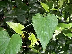 A much-branched climbing perennial herb, with twining stems up to 2.5 m originating from a woody rootstock.[4] The leaves are hairless or thinly hairy with serrated margins.[1] The hairs sting fiercely.[1] Inflorescences are up to 5.5 cm long with peduncles up to 2 cm long.[4] The inflorescences are composed mostly of tiny[1] male flowers with 1–2 female flowers below or else all male.[4]