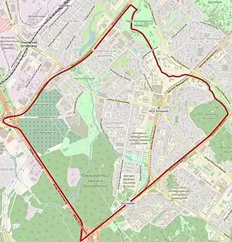 Troparyovo-Nikulino District is an administrative district (raion) at the southern edge of Western Administrative Okrug, and one of the 125 raions of Moscow, Russia.[3] The western border is the Moscow Ring Road, and the southern border is Leninsky Prospekt. The area of the district is 11.26 square kilometers (4.35 sq mi).[1] Population: 119,000 (2016 est.)