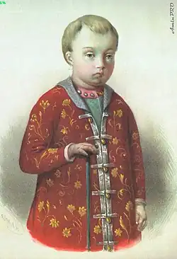Dmitry was born on 1 November [O.S. 22 October] 1648, the day of the festival of the Mother of God of Kazan icon.[1] He was the first son of Alexis of Russia by his first wife Maria Miloslavskaya, who married the tsar on 16 January (O.S.) the same year.[1] His baptism took place on 29 October, with the officiating priest being Patriarch Joseph.[1] The godmother of the tsarevich was Tsarevna Irina Mikhailovna and the godfather was archimandrite Adrian of the Trinity Lavra of St. Sergius.[1]