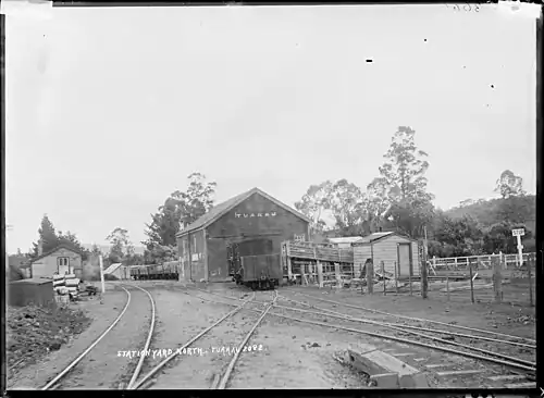 The railway, some 1.5 mi (2.4 km) north of the original Tuakau village,[7] opened as part of the Auckland and Mercer Railway on 20 May 1875, built by Brogden & Co,[8] when it was extended from Penrose.[9] Trains had been able to reach Tuakau since at least February 1875.[10] Tuakau wasn't shown in the 1875 timetable,[11] but was in that of 1876.[12] There was a stationmaster by June 1876[13] and fencing of the stationmaster's house was mentioned in September 1878.[14]