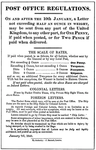 - ^ "Rowland Hill's Postal Reforms", The British Postal Museum & Archive, Word press, Aug 21, 2009