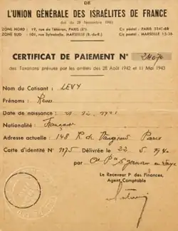 The General Union of French Israelites (French: Union générale des israélites de France, UGIF) was a body created by the antisemitic French politician Xavier Vallat under the Vichy regime after the Fall of France in World War II. UGIF was created by decree on 29 November 1941 following a German request, for the express purpose of enabling the discovery and classification of Jews in France and isolating them both morally and materially from the rest of the French population.[1] It operated in two zones: the northern zone, chaired by André Baur, and the southern zone, under the chairmanship of Raymond-Raoul Lambert.[2]