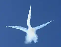 The three memorial spires range from 201 feet (61 m) to 270 feet (82 m) high and appear to be soaring; its array of stainless steel arcs against the sky evokes the image of "contrails of the Air Force Thunderbirds as they peel back in a precision 'bomb burst' maneuver." Only three of the four contrails are depicted, at 120 degrees from each other, as the absent fourth suggests the missing man formation traditionally used at Air Force funeral flyovers.[5]