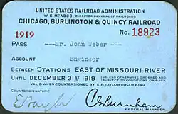 Chicago, Burlington and Quincy Railroad employee's pass issued by USRA