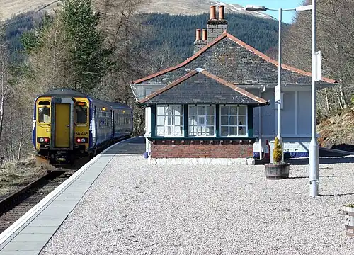 Upper Tyndrum railway station is one of two railway stations serving the small village of Tyndrum in Scotland. It is on the Fort William route of the scenic West Highland Line, between Crianlarich and Bridge of Orchy, sited 41 miles 25 chains (66.5 km) from Craigendoran Junction, near Helensburgh.[4] Services are operated by ScotRail - who manage the station - and Caledonian Sleeper.