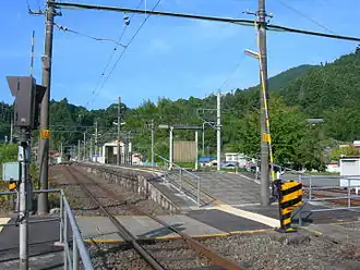 The station has one ground-level island platform connected to the station building by a level crossing. The station is unattended.