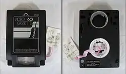 The VX cassette itself had both reels of 12-inch-wide (13 mm) magnetic tape stacked on top of each other in a coaxial fashion (much like the earlier Cartrivision and Philips VCR formats) in the bottom half of the tape, with a circular opening on the underside of the top half of the cassette, where the video head drum would enter. The tape in this opening was pre-formed in a loop to go around the head drum, eliminating the need for the tape to be pulled out of the cassette and threaded around the drum (as with later videocassette formats such as VHS and Betamax). The opening was protected by a cylindrical plastic plug to protect the tape, which was unscrewed from the opening when the tape was loaded in the machine (by means of moving a horizontal lever on the front of the machine), and inserted back into the tape when ejected (by moving the lever back).