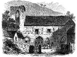 The location on which Valle Crucis was raised was originally established as a colony of twelve monks[5] from Strata Marcella,[4] an earlier abbey located on the western bank of the River Severn near Welshpool.[6] A temporary wooden structure was replaced with stone structures of roughly faced rubble.[5] The completed abbey is believed to have housed up to about sixty brethren, 20 choir monks and 40 lay-members who would have carried out the day-to-day duties including agricultural work. The numbers within the church fluctuated throughout its history and the monks and the abbey itself came under threat from various political and religious events. The abbey is believed to have been involved in the Welsh Wars of Edward I of England during the 13th century, and was supposedly damaged in the uprising led by Owain Glyndŵr. Numbers also fell after the Black Death ravaged Britain.
