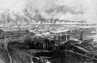 The Spanish bombarded the town unhindered.[5] The loss in public and private property was estimated at $1,000,000, and in merchandise at $9,000,000, huge sums at the time.[6] A 2011 account suggests that in that year's money the losses amounted to the equivalent of around $224,000,000.[7]