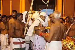Vattappalai Poosari holding the sea water, which will later be lit as a lamp