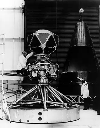 All spacecraft were manufactured by TRW and launched in pairs, either on an Atlas-Agena or Titan III-C boosters. They were placed in orbits of 118,000 km (73,000 miles)[1] to avoid[2] particle radiation trapped in the Van Allen radiation belts. Their apogee was about one-third of the distance to the Moon. The first Vela Hotel pair was launched on 17 October 1963,[3] one week after the Partial Test Ban Treaty went into effect, and the last in 1965. They had a design life of six months, but were only actually shut down after five years. Advanced Vela pairs were launched in 1967, 1969, and 1970. They had a nominal design life of 18 months, later changed to seven years. However, the last satellite to be shut down was Vehicle 9 in 1984, which had been launched in 1969 and had lasted nearly 15 years.