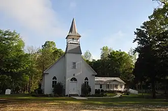 The church is a one-story, gable fronted rectangular example of Gothic Revival style architecture. The building faces south fronting a road that runs from Vernal River Road to Winborn Chapel Road. An approximately 55-foot (17 m) tall tower rises from a foyer in front of the sanctuary. The sanctuary has a steep gable roof covered with shingles. The tower has a belfry with open handrails and a very steeply angled steeple roof. There are two windows with Gothic art glass transoms flanking the entry. The character of the building is further enhanced by the five windows on the east and west elevation with similar transoms. The rear elevation (north) contains an addition for a Sunday school from 1954 and a wing added to that addition of a fellowship hall from 1974. Inside the sanctuary ceiling is 20 feet (6.1 m) high and original fittings and details remain. These include choir seating and a lectern as well as a communion table and pulpit chairs from the congregation's previous church.[2]