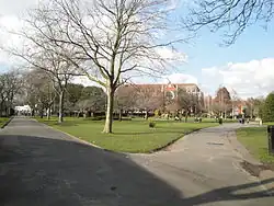 Victoria Park is a public park located just to the north of Portsmouth Guildhall, adjacent to Portsmouth and Southsea railway station and close to the city centre in Portsmouth, Hampshire. It was officially opened on 25 May 1878 and was the first public park to be opened in Portsmouth. It was designed by Alexander McKenzie.[1] The land had previously been the site of part of Portsmouth's defensive ramparts.[1] It has a total area of around 15 acres (61,000 m2) and is planted with trees, shrubs and flowers. The centre of the park features an enclosed area which houses animals such as birds, rabbits and guinea pigs.[2][3][4][5][6] The park has a brick and rubble lodge.[1] A second lodge didn't survive to the present day.[1]