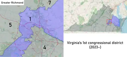 Virginia's first congressional district is a United States congressional district in the commonwealth of Virginia. It streches from the Richmond suburbs towards the Northern Neck and Middle Peninsula. The district encompasses the Historic Triangle of Jamestown, Williamsburg, and Yorktown. It has been represented by Republican Rob Wittman since 2007.