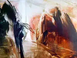 And nevertheless Vladimir Lisunov's artistic style can be defined as mystic symbolism, in which the idea of infinity, a continuum of historic evolution, shows the movement of an astral phantom which unites worlds and epochs.