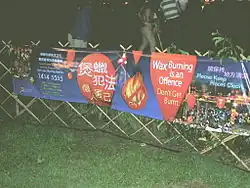 A law was implemented in 2003 prohibiting "melt or burn any wax or sprinkle or pour any liquid onto any hot wax, in such a manner as to cause or as to be likely to cause a risk of injury to any person or damage to any property" in public parks, beaches or barbecue areas. Offenders face a maximum penalty of HK$2,000 and 14 days imprisonment.[3] The Housing Department (HD) also prohibits the practice, claiming that five points deduction and a $1,500 fixed penalty notice will be imposed on offenders in its public housing estates.[4] Leaving behind wax stains in public places will also fall under "littering" and is liable to a HK$3000 fine.[5]