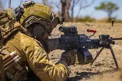 Light machine gun | 5.56×45mm NATO | Light machine gun designated the Light Support Weapon (LSW) chambered for 5.56×45mm NATO. The F89 is also manufactured under licence in Australia by Thales Australia. Special forces units use the Para Minimi variant with a shortened barrel and sliding buttstock.[18] | |