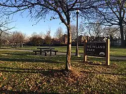 Weinland Park is a neighborhood north of downtown Columbus, Ohio and encompassed by the boundaries of the University District. A development boom in the 1930s and 1940s resulting from new streetcar lines and the blossoming of factories brought working and middle-class families to the neighborhood. Current housing stock consists primarily of single family residential buildings that have been converted to rentals or multifamily housing. Row-homes and apartment buildings are also ubiquitous in the neighborhood. Renters currently outnumber owners.[1] Commercial and entertainment facilities are concentrated on the North High Street corridor, but also pocket the inner part of the neighborhood as well. Weinland Park saw the sapping of its population and wealth with the rise of newer suburbs ringing the outer reaches of the city and the collapse of local industry and streetcar lines. The neighborhood has been plagued with crime and drug problems for decades but has recently seen a flood of new investment that has brought growth and revitalization to this long struggling neighborhood. Investment into the community includes the South Campus Gateway providing retail and residential finished in 2005, and a new food district and employment center.[2]