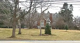 Wellington House, also known as Charles Estabrook Mansion, is a historic home located at Fayetteville, Onondaga County, New York. It was designed by Ward Wellington Ward built in 1922–1923. The main house is a two-story, brick, stone, and half-timber Tudor Revival style mansion topped by a prominent slate roof. It features a Tudor-arched front porch and stone portal. In addition to the main house, the property includes the contributing gardener's residence; combined garage, stables, and greenhouse building; formal garden; brick gateway; two small utility buildings; and the original curving drive.[2]: 5