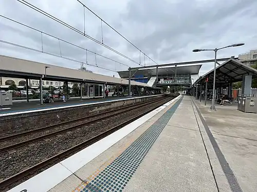 West Ryde station opened on 17 September 1886 as Ryde, being renamed West Ryde on 8 October 1945.[3] Immediately north of the station, a loop that runs to Epping commences. This opened on 24 October 1978.[4] On 27 November 1989, a southbound loop from Eastwood opened, this resulted in the existing southbound platform being converted to an island platform.[5][6][7]