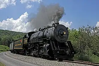 As No. 734 continued to operate, the WMSR earned the locomotive the nickname Mountain Thunder, and retired WM steam crews and historians favorably compared it to scrapped WM H Class locomotives.[2][3][31][32] On July 20, 1997, No. 734 pulled ten CSX hopper cars for a WMSR photographer charter, which was organized by Carl Franz.[29][25] The locomotive was subsequently used to pull freight trains for additional photo charters in the following years.[6][33][34] In 1998, the locomotive was modified with an automatic coal stoker, allowing for easier labor for the fireman during the summer months.[35] Also in 1998, No. 734 was filmed for a television commercial that promoted the Pontiac Montana minivan.[36] In the early 2000s, No. 734 would be taken out of service to undergo some major boiler tub replacements and other repairs, but was soon back in service hauling excursion trains.[2] In July 2003, during that year's National Railway Historical Society (NRHS) Convention, an Amtrak excursion ran from Baltimore to Cumberland, and passengers were transferred to the WMSR for a trip between Cumberland and Frostburg behind No. 734.[37][38]