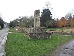 It comprises a standing limestone monolith on a limestone base with two deep steps. The roughly-formed standing stone, arranged upright like the stump of a cross, comes from quarry at Heythrop Park. The base is made of Headington stone from Brasenose Quarry in Headington.