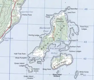 Sitting southeast of Little Wood Island,[6] White Horse Islet has a steel navigation aid tower.[7] There are two dangerous sunken rocks off its edge.[8]